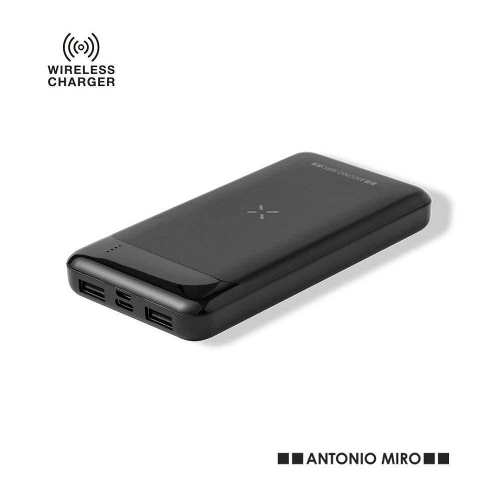 Batería auxiliar externa de Antonio Miró, en elegante acabado negro mate, con logotipo de la marca en carcasa. Fabricada en resistente ABS, con 5.000 mAh de capacidad y cargador inalámbrico integrado 5W.